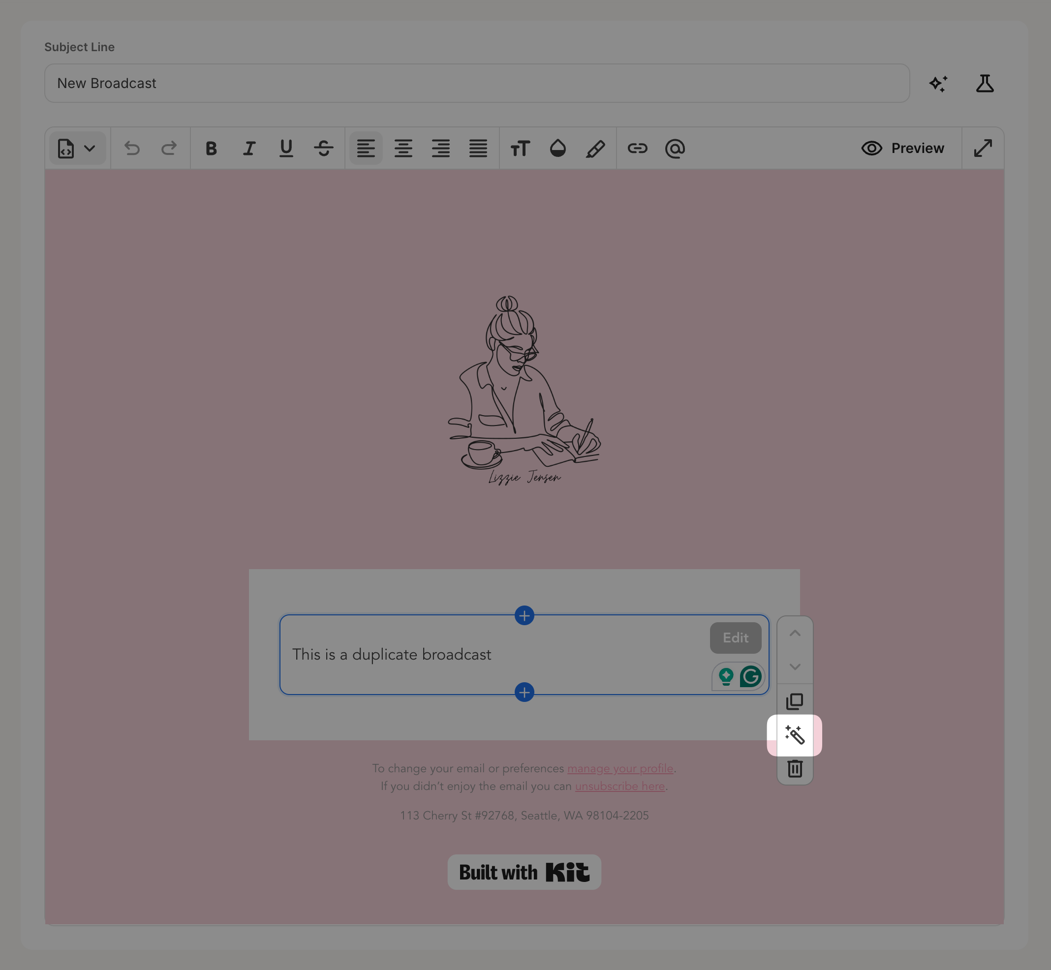 To make your content editable, click anywhere in your broadcast's contents, then click the magic wand icon on the right-hand side.